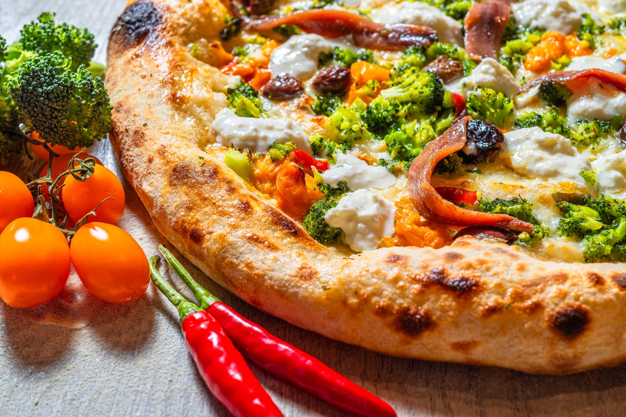 Alta alla napoletana. IN FORNO: Mozzarella fior di latte pomodorini datterini gialli broccoli saltati in padella leggermente piccanti olive taggiasche. FUORI FORNO stracciatella e acciughe del mar cantábrico