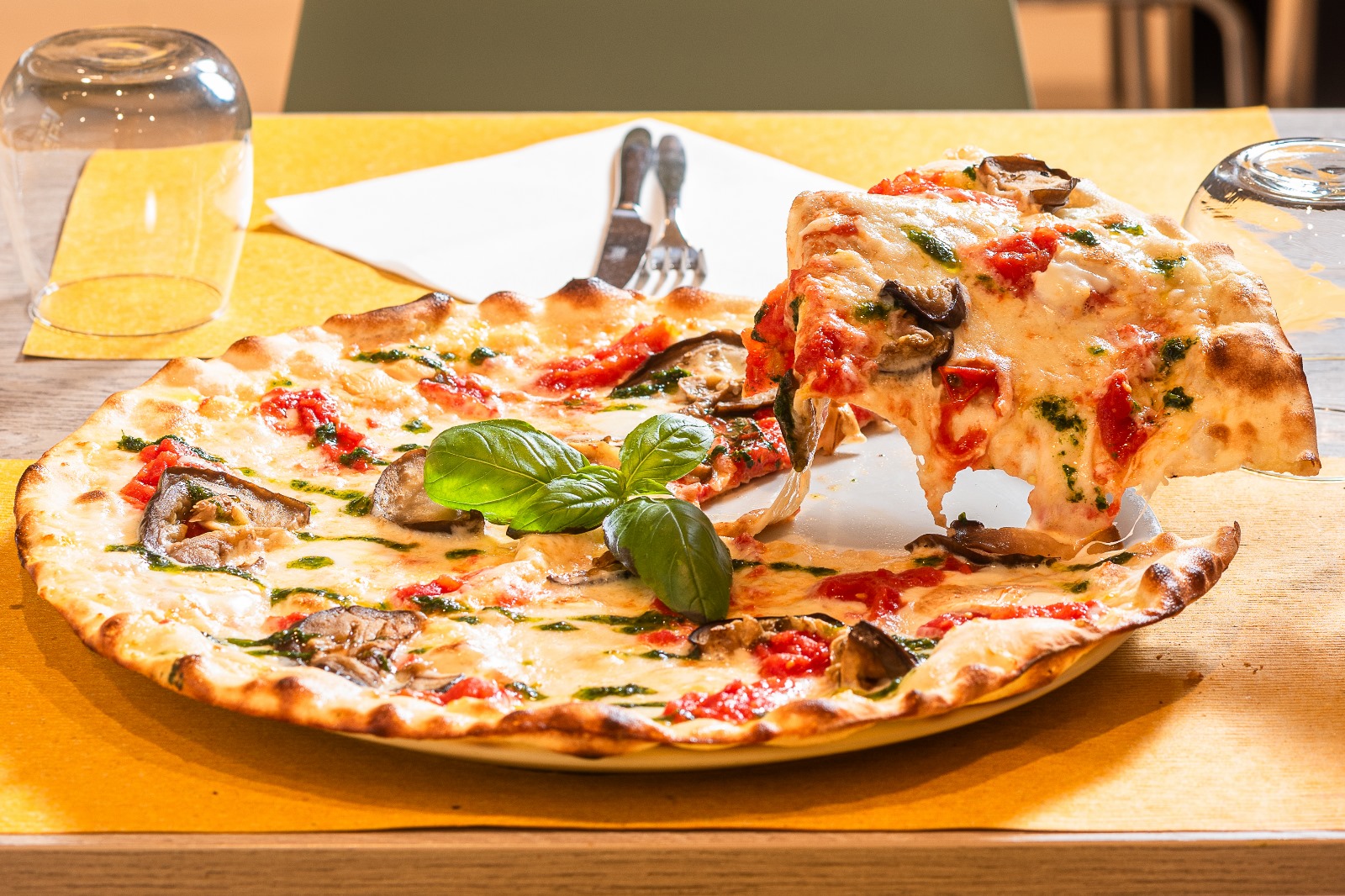pomodoro spezzato a mano, mozzarella di latte di bufala affumicata, melanzane, fuori forno olio al pesto di basilico e basilico